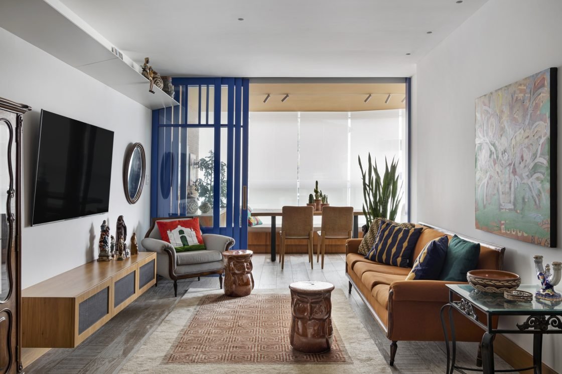 No projeto em destaque, por exemplo, os móveis herdados aparecem ao lado de cores vibrantes sobre uma base neutra, valorizando as peças de época.